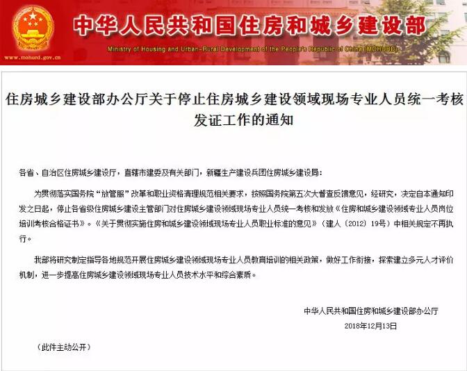 為貫徹落實(shí)國(guó)務(wù)院“放管服”改革和職業(yè)資格清理規(guī)范相關(guān)要求,按照國(guó)務(wù)院第五次大督查反饋意見,經(jīng)研究,決定自本通知印發(fā)之日起,停止各省級(jí)住房城鄉(xiāng)建設(shè)主管部門對(duì)住房城鄉(xiāng)建設(shè)領(lǐng)域現(xiàn)場(chǎng)專業(yè)人員統(tǒng)一考核和發(fā)放《住房和城鄉(xiāng)建設(shè)領(lǐng)域?qū)I(yè)人員崗位培訓(xùn)考核合格證書》。《關(guān)于貫徹實(shí)施住房和城鄉(xiāng)建設(shè)領(lǐng)域現(xiàn)場(chǎng)專業(yè)人員職業(yè)標(biāo)準(zhǔn)的意見》(建人﹝2012﹞19號(hào))中相關(guān)規(guī)定不再執(zhí)行。